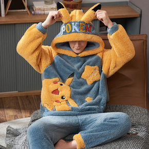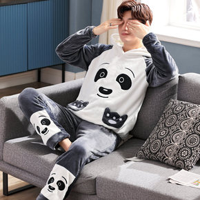男士睡衣秋冬季珊瑚绒加厚加绒卡通连帽家居服冬天法兰...