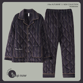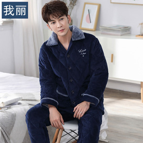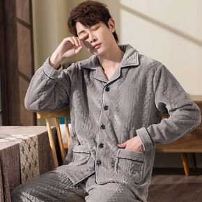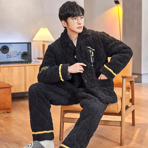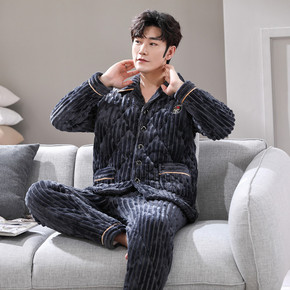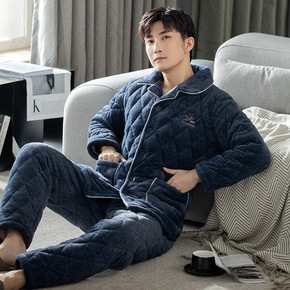 珊瑚绒三层夹棉睡衣男冬天新款加厚加绒保暖宽松套装家...