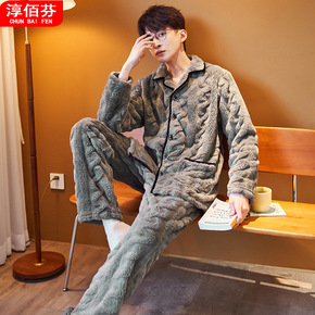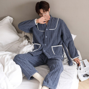 法兰绒睡衣男士秋冬加绒加厚珊瑚绒麻花睡衣两件套开衫...