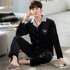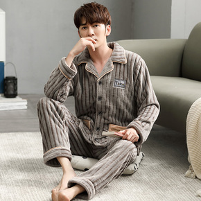 秋冬季珊瑚绒睡衣男冬加厚保暖大码家居服男士开衫翻领...