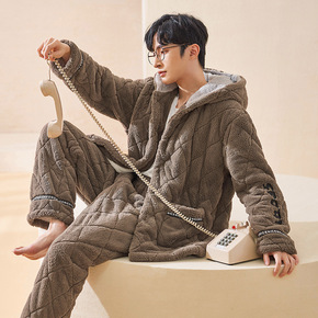冬季男士长毛绒睡衣三层加厚夹棉保暖珊瑚绒家居服连帽...