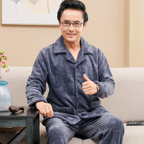 冬季睡衣男士法兰绒加厚加绒保暖家居服宽松中年爸爸珊...