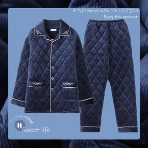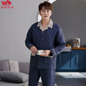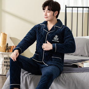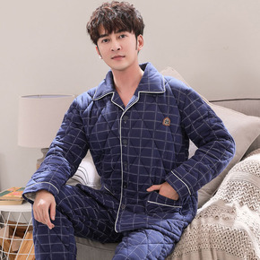 男士睡衣冬季三层加厚夹棉翻领保暖青年家居服可外穿大...