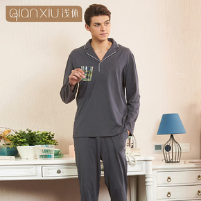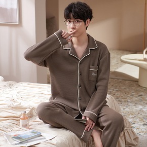 娜新元睡衣男春秋季长袖棉质华夫格纯色开衫翻领港风家...