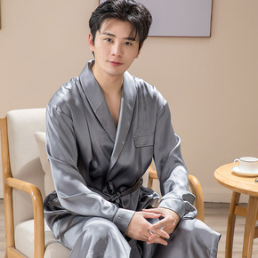 现货薄款春秋季纯色V领男士居家睡袍舒适透气桑蚕丝家...