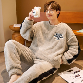 男士睡衣秋冬季长毛绒加绒加厚青少年家居服大码保暖套...