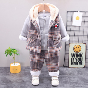 童装男童加绒加厚冬装中小童长袖保暖卫衣格子连帽马甲...