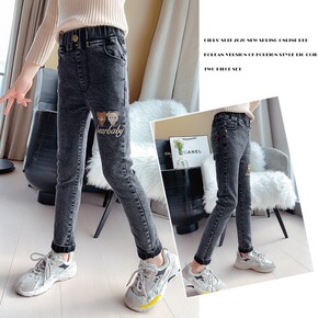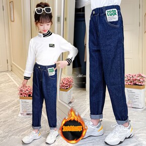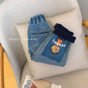 冬季女童卡通加绒牛仔裤2021新款加绒加厚牛仔长裤...