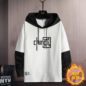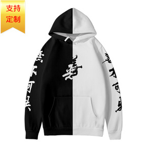 黑白善恶拼色国潮卫衣男宽松大码嘻哈港风文化衫加绒带...