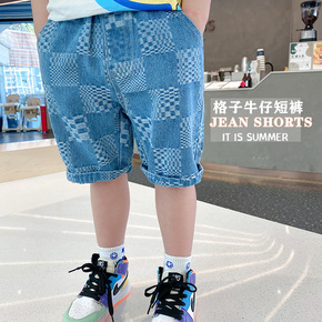 童装男童牛仔短裤2022夏季新不规则提花格子牛仔短...