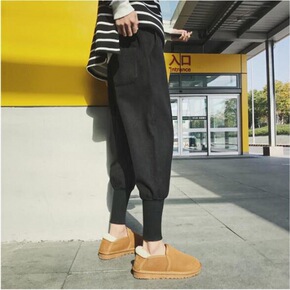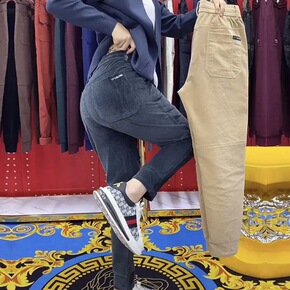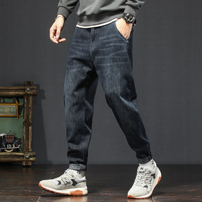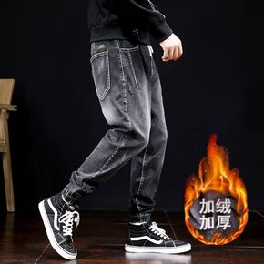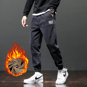 牛仔裤男2021新款秋冬季加绒加厚工装宽松束脚哈伦...