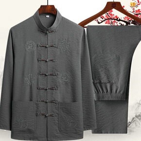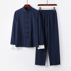 唐装男长袖棉麻套装春秋季中老年人衣服中国风男装爸爸...