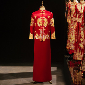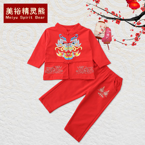铜钱秋宝宝抓周服长袖男绸缎唐装动物图案套装批发红色...