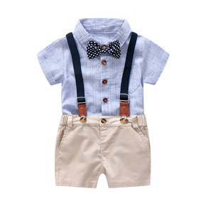 婴儿男宝宝绅士套装短袖衬衫领结背带裤帅气外贸夏季服...