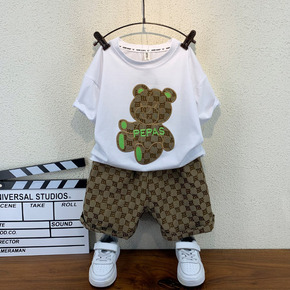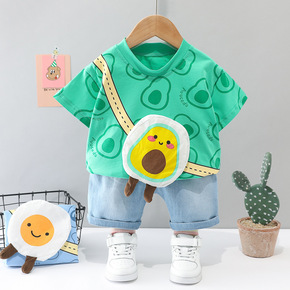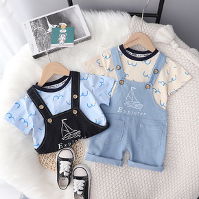 2022夏季新款韩版男童短袖卡通T恤+牛仔短裤五分...