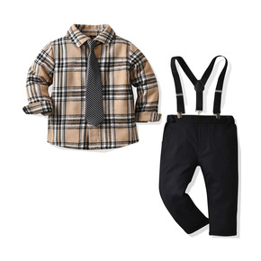 跨境童装 男童欧美长袖撞色衬衣背带裤 绿色领结绅士...