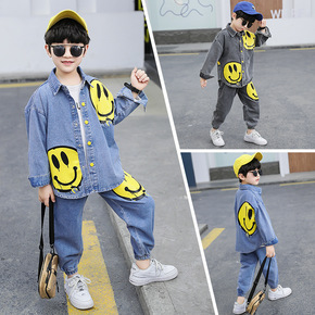 男童牛仔套装2022新款韩版儿童笑脸牛仔衬衣两件套...
