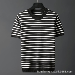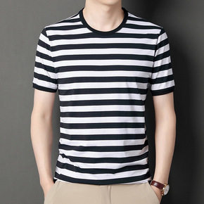 代发条纹T恤短袖男圆领修身棉质2022款打底半截袖...