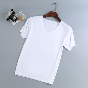 新款男士短袖T恤莱卡棉纯色修身韩版紧身圆V领男士打...