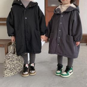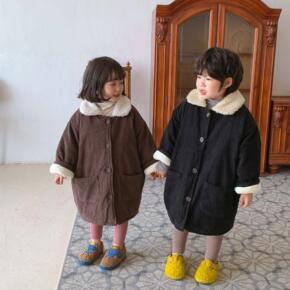 韩国童装冬中长儿童灯芯绒夹棉加绒棉衣男女童宝宝连帽...