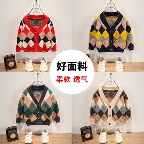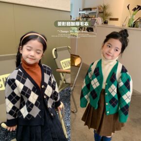 爆款菱形格开衫男童女童秋季春季洋气外套白搭潮范...