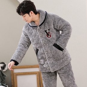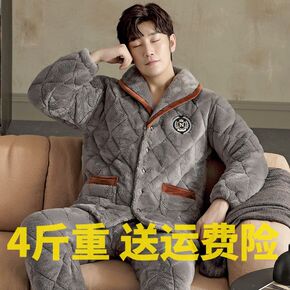 冬季三层夹棉睡衣男加绒加厚中长款法兰绒中老年宽松大...