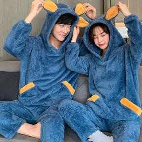 法兰绒睡衣男秋冬季连帽加厚加绒网红珊瑚绒女保暖家居...