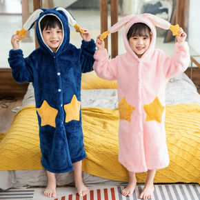 儿童睡袍男秋冬加绒加厚珊瑚绒睡衣带帽长款女孩浴袍中...
