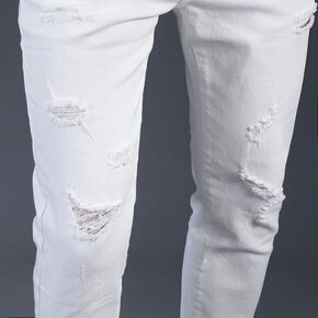 春夏季美式破洞牛仔裤男修身潮牌浅色薄款刮烂乞丐裤潮...