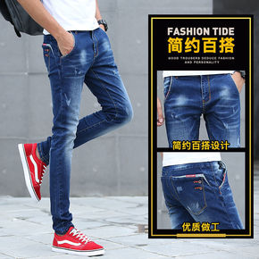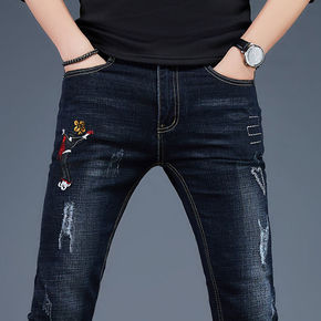 夏季薄网红男装刺绣男士破洞牛仔裤男修身小脚裤弹力韩...