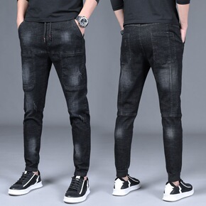 男士弹力松紧腰牛仔裤青年修身束脚系带裤男百搭休闲牛...