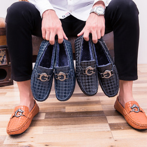 秋冬季加绒棉鞋真皮豆豆鞋男时尚休闲男鞋英伦加毛皮鞋...