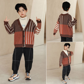 2021新品秋冬儿童毛衣 长袖拼接开衫羊绒衫 v字...