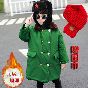 儿童军棉大衣绿色加绒加厚中长款棉袄男女童宝宝冬季复...