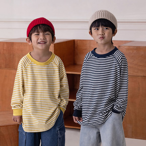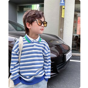2022春款童装卫衣 韩版条纹珠地绿色领子男童翻领...