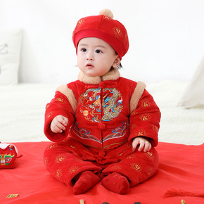 宝宝唐装连体哈衣爬服婴儿秋冬新年满月服拜年服带帽子...