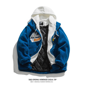 羊羔毛棉衣男冬季情侣宽松连帽棉服男潮牌假两件休闲外...