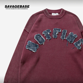 vintage美式复古洗水做旧牛仔贴布字母毛衣男宽...