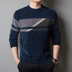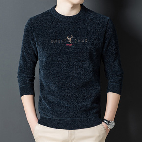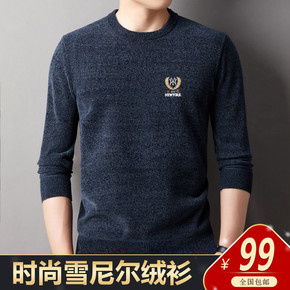 男士雪尼尔毛衣秋冬新款加绒韩版时尚长袖圆领中年男式...