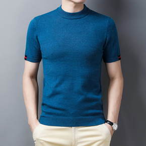 2021秋冬短袖半高领羊毛打底衫男士纯色内搭毛衣半...