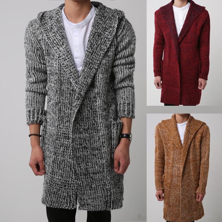 跨境电商2021男装新款休闲时尚开衫连帽长款毛衣针...