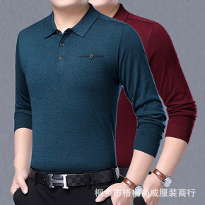 2022春秋男士长袖T恤翻领宽松纯色中年薄款混纺羊...