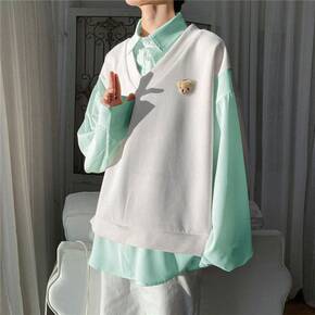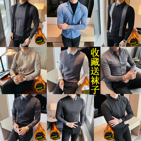 假两件半高领毛衣衬衫男长袖修身韩版潮流加厚衬衣外套...