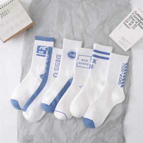 袜子男学院风个性字母运动情侣棉袜白蓝简约系列男街头...