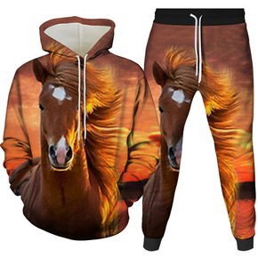 2020秋冬亚马逊动物 马 3D数码印花套装男女连...