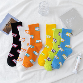 荧光色长袜子女春秋夏ins潮网红中筒袜棉彩色字母日...