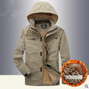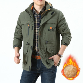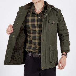 亚马逊现货男士中长款连帽棉衣加绒加厚户外工装防寒保...