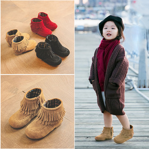 女童流苏短靴2021冬季新款韩版牛筋加绒靴子女童短...