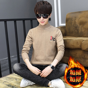 冬季加绒加厚圆领毛衣青少年男针织衫套头纯色打底毛衣...