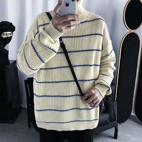 高领毛衣男秋冬韩版潮流ins港风休闲条纹针织衫宽松...